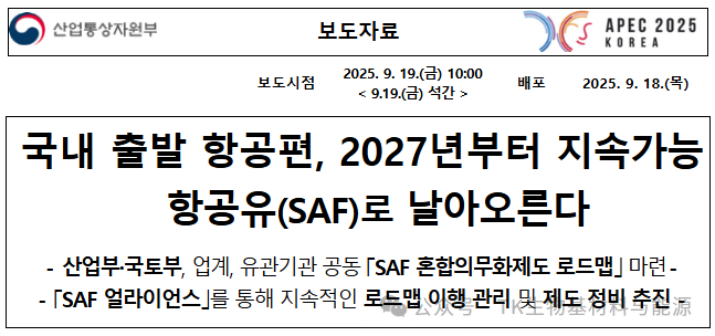 韓國強制:出境航班使用可持續(xù)航空燃料(SAF),從2027年起